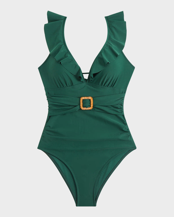 Deep V Ruffled Sleeve Belt Detailing Ruched Swimsuit