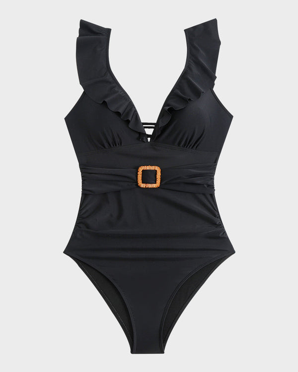 Introducing the Deep V Ruffled Sleeve Belt Detailing Ruched Swimsuit, a chic and fashionable choice for your beach or pool outings. This swimsuit combines elegant design elements with practical features, ensuring you look stunning while enjoying the sun.