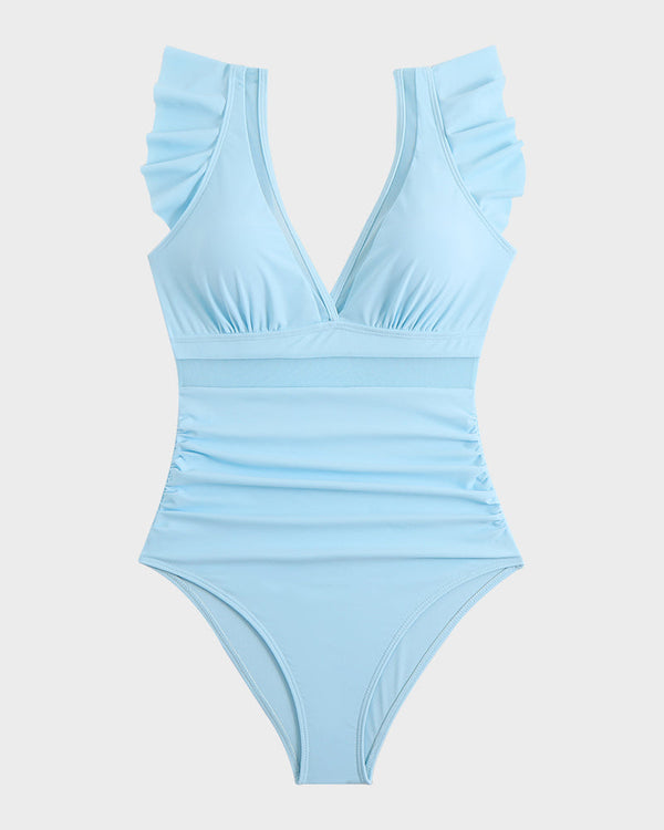 Introducing the Deep V Ruffled Sleeve Mesh Panel Ruched Swimsuit, a stunning and fashionable choice for your beach or pool outings. This swimsuit combines elegant details with modern design, ensuring you make a stylish statement all summer long.