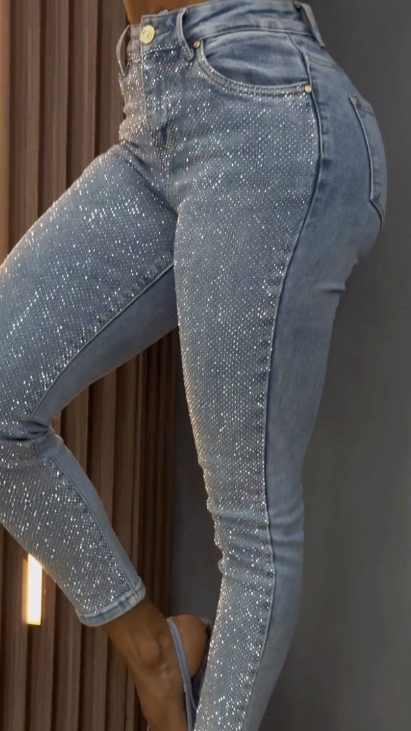 Women's Single-sided Elastic Rhinestone Slim Fit Casual Jeans